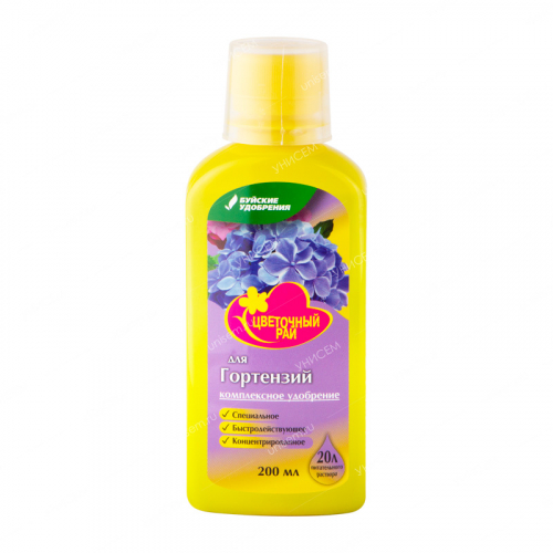 Буйские удобрения Цветочный рай для гортензий– жидкое концентрированное комплексное удобрение. Применяется в качестве корневой и внекорневой подкормки для всех видов гортензий. Препарат способствует здоровому росту и развитию, стимулирует развитие листового аппарата, обеспечивает пышное и длительное цветение, придает растениям красивый внешний вид, повышает устойчивость растений к болезням, вредителям и неблагоприятным условиям внешней среды.• Удобрение содержит полный комплекс веществ, необходимых для полноценного и сбалансированного питания растений.