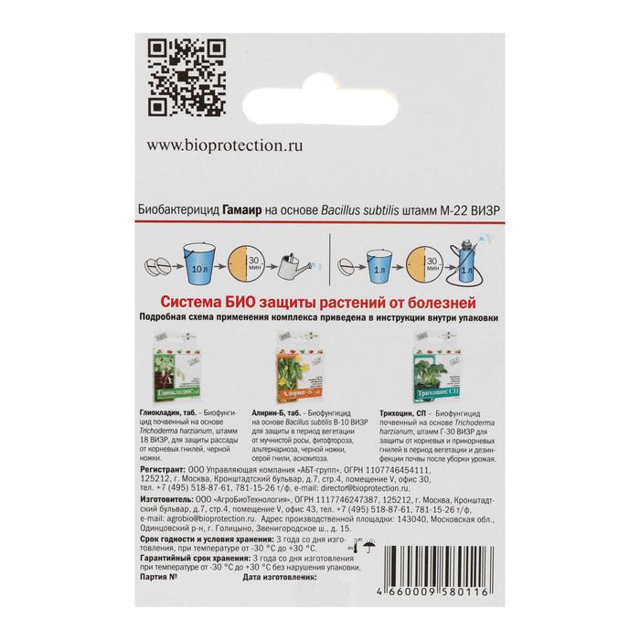 Гамаир, таб - биологический бактерицид на основе природной бактерии Bacillus subtilis М – 22 ВИЗР, предотвращающий пятнистости на листьях, бактериальные гнили, паршу, монилиоз, бактериальный рак, сосудистый и слизистый бактериозы.