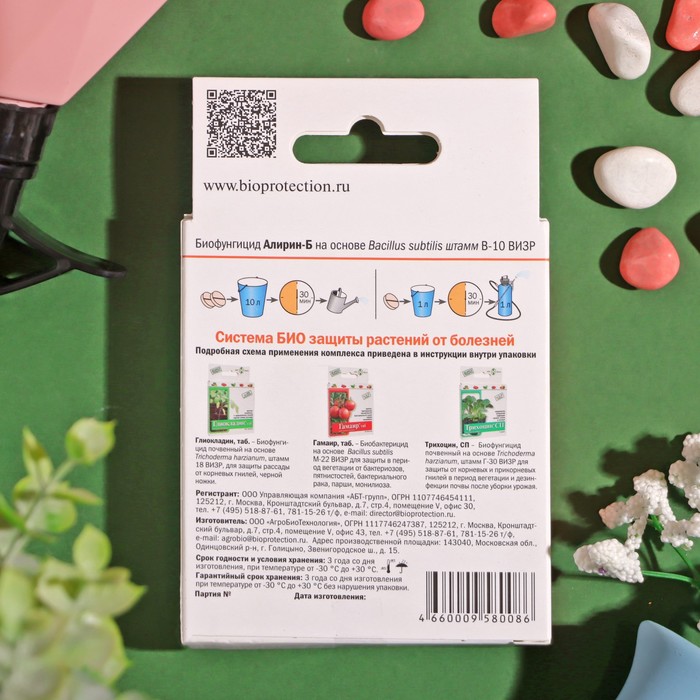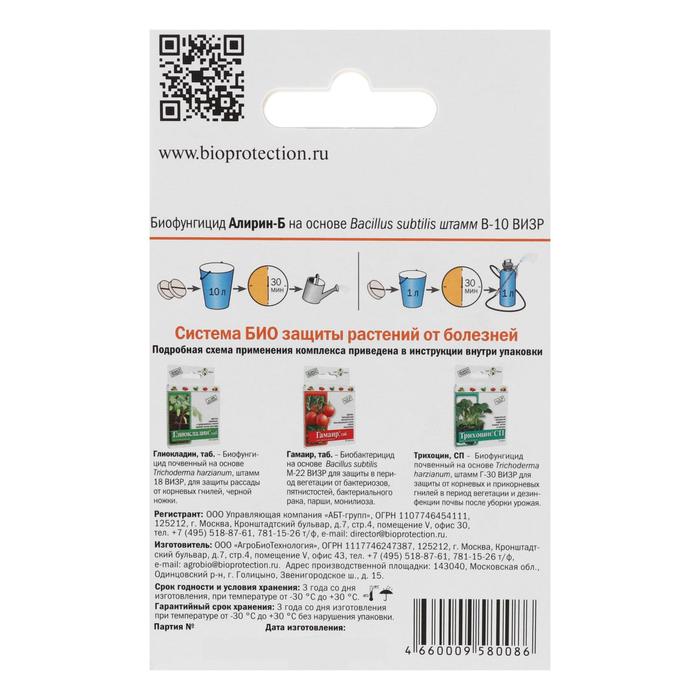 Алирин-Б, таб - биологический фунгицид на основе природной бактерии Bacillus subtilis 10-ВИЗР, предотвращающий возникновение корневых гнилей, черной ножки, мучнистой росы, фитофтороза, альтернариоза, аскохитоза, серой гнили.