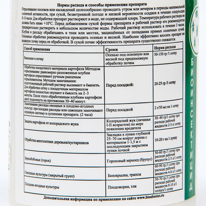 Состав препарата и механизм действия: положительное действие препарата основывается на высокой энтомопатогенной активности почвенных грибов рода Beauveria. Находящиеся в почве споры гриба, при контакте с телом вредителя поражают вредителя, в результате вредитель погибает и становится источником развития для самого гриба и другой микрофлоры почвы. Также грибы рода Beauveria способны к эндофитной колонизации поверхности корневой системы растения. При этом микроорганизмы являются активными продуцентами комплекса фитогормонов, которые обеспечивают стимуляцию роста и физиологической активности на протяжении всего периода роста растений.