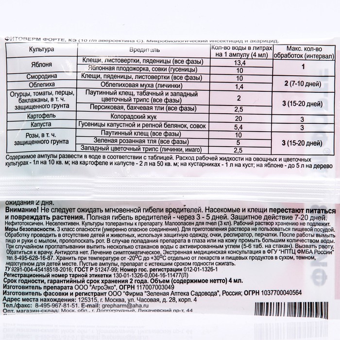 БИО инсектицид «Фитоверм-ФОРТЕ», от вредителей растений, пластиковая ампула 4 мл