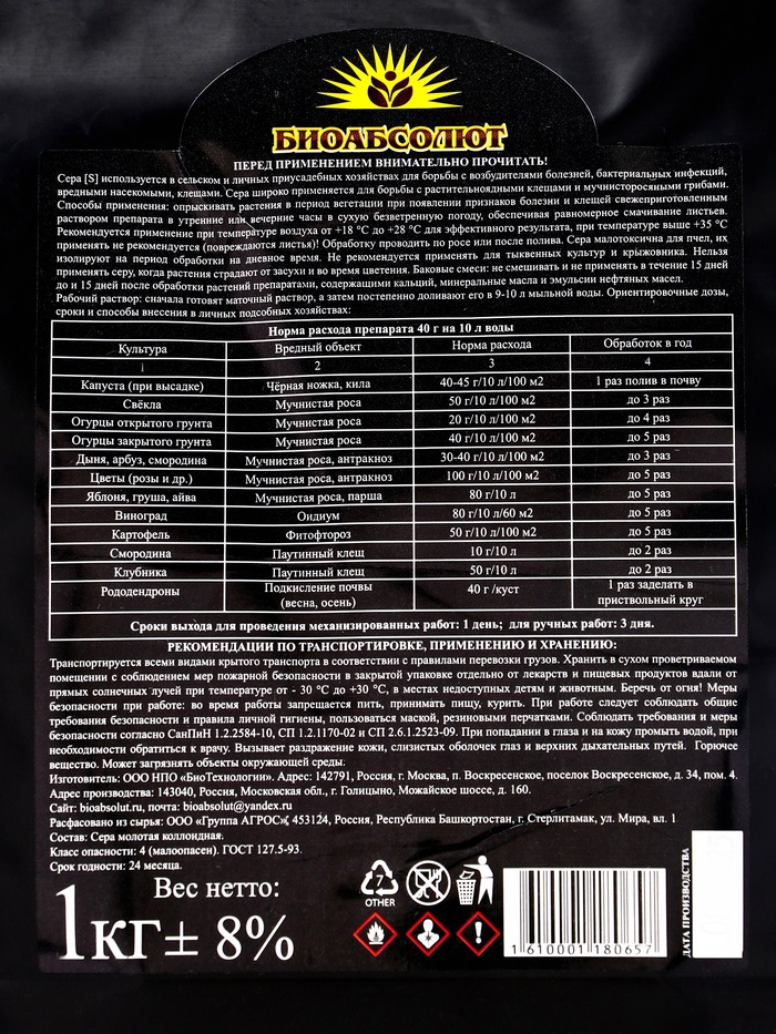 Сера коллоидная. Фунгицид, инсектоакарицид. Порошок
