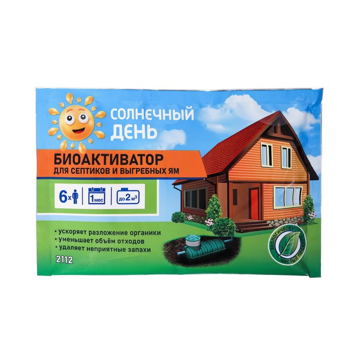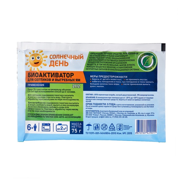 Биоактиватор для септиков и выгребных ям - сильнодействующее средство, разработанное на основе специальной композиции почвенных бактерий, предназначенное для ускорения естественных биологических процессов разложения органических веществ, в том числе фекалий, жиров, бумаги, моющих веществ и фенолов, уничтожения неприятных запахов в канализационных системах. Пакет 75 г рассчитан на резервуар объёмом 1,5 - 2 кубических метра при использовании семьёй до 6 человек. Для септиков: содержимое пакета засыпать в унитаз и дважды спустить воду. Повторить обработку через месяц или по мере необходимости. Для выгребных ям: содержимое пакетика высыпать в ведро, разбавить водой, вылить в яму резервуара. Если яма обезвожена, добавить воду для эфективности. Повторить обработку через месяц или по мере необходимости. Состав: пшеничные отруби, натрий двууглекислый, микроорганизмы. Срок годности: 3 года.