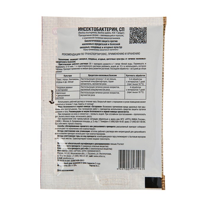 Биологический инсектофунгицид «Ортон», «Инсектобактерин», пакет, 20 г