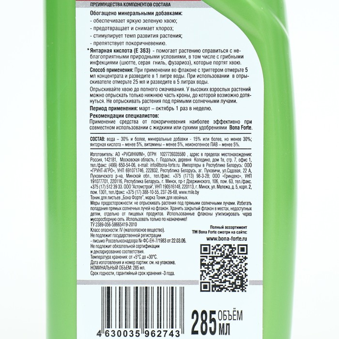 *Янтарная кислота (E 363) - помогает растению справиться с неблагоприятными природными условиями, в том числе с грибными инфекциями (шютте, серая гниль, фузариоз), которые портят хвою. Способ применения: При применении во флаконе с триггером отмерьте 5 мл концентрата и разведите в 1 литре воды. При использовании в опры- скивателе отмерьте 25 мл и разведите в 5 литрах воды. Опрыскивайте хвою до полного смачивания. У высоких взрослых растений можно опрыскать только нижнюю часть кроны, до которой возможно дотянуться. Не опрыскивать растения под прямыми солнечными лучами. Период применения: март - октябрь 1 раз в неделю. Рекомендации специалистов: