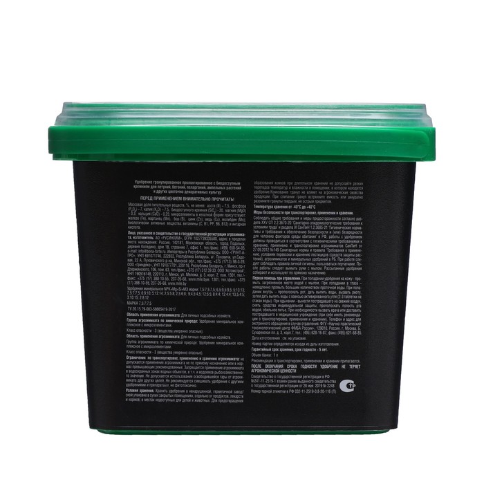 Удобрение Для петуний, бегоний, пеларгоний, ампельных растений и других цветочно-декоративных культур произведено по уникальной передовой технологии «SIIOG», обеспечивающей важные качественные преимущества перед традиционным смешением:Равномерное внесение – благодаря содержанию всех компонентов в одной грануле растение гарантированно обеспечивается КАЖДЫМ элементом питания.Пролонгированное действие – благодаря входящему в состав удобрения цеолиту питательные вещества высвобождаются постепенно и усваиваются растениями по мере потребности (одного внесения хватает на весь сезон).Хорошая растворимость – удобрение начинает действовать моментально.Экономичное расходование – благодаря гранулам можно с высокой точностью вносить удобрение и подкармливать растения.Удобрение содержит основные элементы питания в легкоусвояемой форме и сбалансированном соотношении, способствует хорошему росту растений и пышному цветению. При выращивании рассады из семян – внесите 2-3 г на 1 л грунта, тщательно перемешайте.При пересадке рассады в открытый грунт или в кадку (цветочный горшок) – внесите 2-3 г в каждую посадочную лунку и перемешайте с почвой. При посадке или пересадке комнатных растений, а также контейнерных растений – внесите 2-3 г на 1 л грунта, тщательно перемешайте.При заправке клумб, грядок или пересадке растений открытого грунта - равномерно рассыпьте по поверхности почвы из расчета 20-25 г на кв. метр и тщательно взрыхлите верхний слой почвы.Дополнительная информация:После окончания срока годности удобрение не теряет агрономической ценности. Состав: Три основных макроэлемента (NPK): азот (N) - 7,5 %, фосфор (P2O5) - 7 %, калий (K2O) - 7,5 %Si: биодоступный кремний - 20%.Мезоэлементы: магний - 0,3 %, кальций - 0,25 %.Шесть микроэлементов: бор, железо, марганец, цинк, медь, молибден.Микроэлементы находятся в хелатной (легкоусваиваемой) форме.Комплекс витаминов: B1, В6, В12, PP, ССтимулятор роста: янтарная кислота.