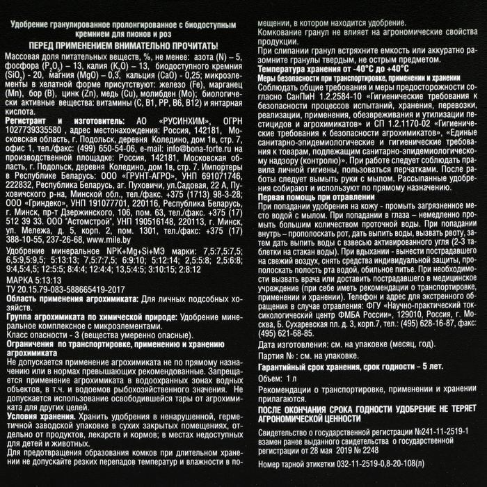 Удобрение Бона Форте для пионов и роз с кремнием, 1 л