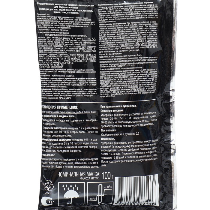 При применении в жидком виде Рекомендуется чередовать корневые и внекорневые подкормки. Для корневой подкормки отмерить 1 г и развести в 1 литре воды или 10 г в 10 литрах воды. Полив до увлажнения земляного кома. Для внекорневой подкормки отмерить 0,5 г и развести в 1 л воды или 5 г в 10 литрах воды. Опрыскивание до полного смачивания листвой поверхности. Избегать попадания на цветки. Как использовать: для овощных культур защищенного и открытого грунта (огурцов, кабачков, цуккини, тыкв, патиссонов) 4-6 раз с интервалом 10-15 дней в течение вегетационного сезон.