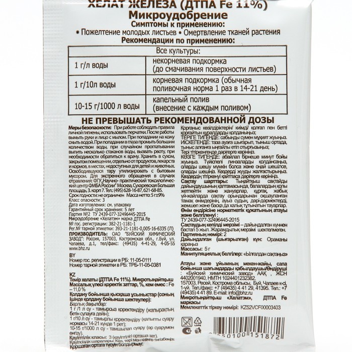 Микроудобрение Хелат железа, 5 г. Микроудобрение содержит железо в хелатной форме. Применяется для корневых и некорневых подкормок в открытом грунте и гидропонных теплицах. Предназначено для профилактики и лечения хлороза. Железо — активный компонент, участвующий в жизнедеятельности растений. Оно способствует обмену веществ, а также является одним из компонентов ферментов, которые обеспечивают дыхание и образование хлорофилла.