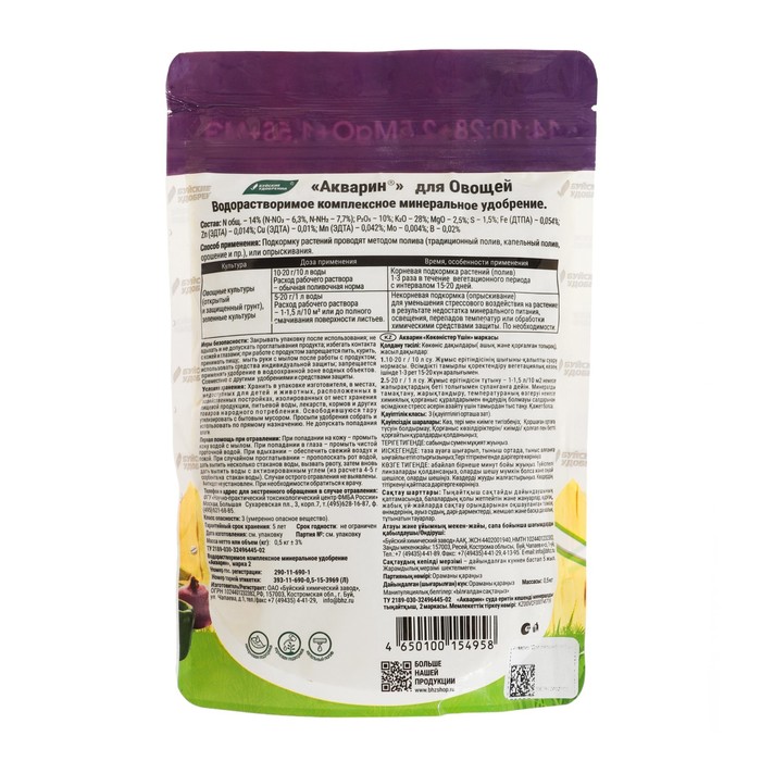 Акварин Для овощей - водорастворимое удобрение, в состав которого входит азот, фосфор, калий, магний, сера и микроэлементы – железо, цинк, марганец, медь в хелатной форме, а бор и молибден – в минеральной. Благодаря кислой реакции (рН) удобрения, оно легко растворяется в холодной воде и более эффективно усваивается корневой системой или листовой поверхностью растений.
