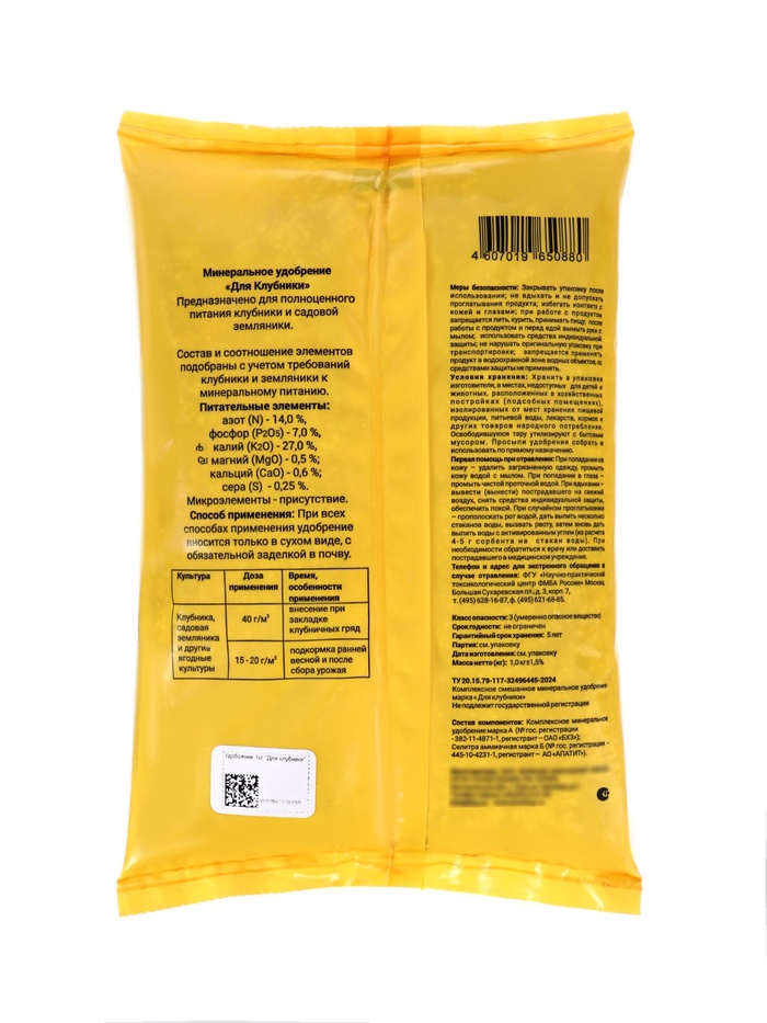 Назначение: комплексное минеральное удобрение для полноценного питания клубники. Состав и соотношение элементов питания подобраны с учетом требований клубники к минеральному питанию.