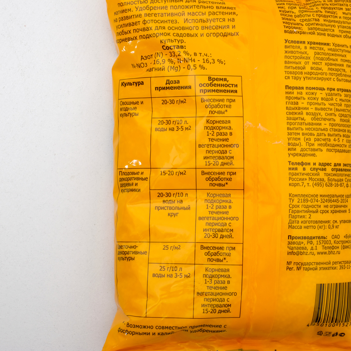 Назначение: Удобрение предназначено для развития вегетативной массы растения и усиления фотосинтеза. Используется на любых почвах для основного внесения и корневых подкормок садовых и огородных культур.