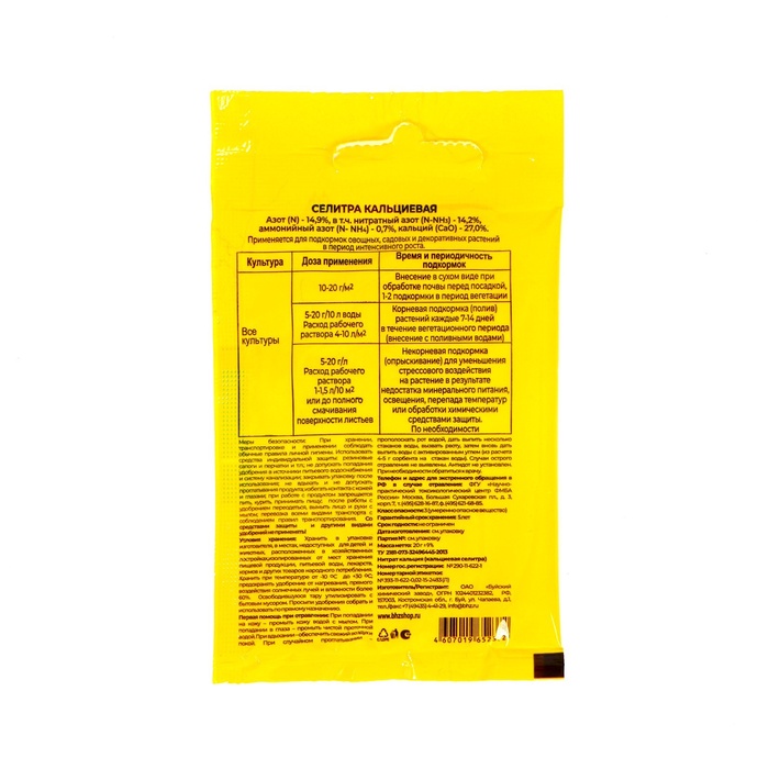«Селитра кальциевая» — это комплексное минеральное удобрение для подкормок овощных, плодовых, цветочных и декоративных культур. В его состав входят кальций (27 %) и азот (14,9 %). Средство представляет собой полусферические гранулы белого и желтоватого цвета.