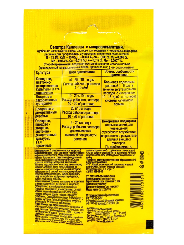 Назначение: используется в качестве водорастворимого азотно-калийного удобрения с микроэлементами для корневых и некорневых подкормок всех сельскохозяйственных культур.