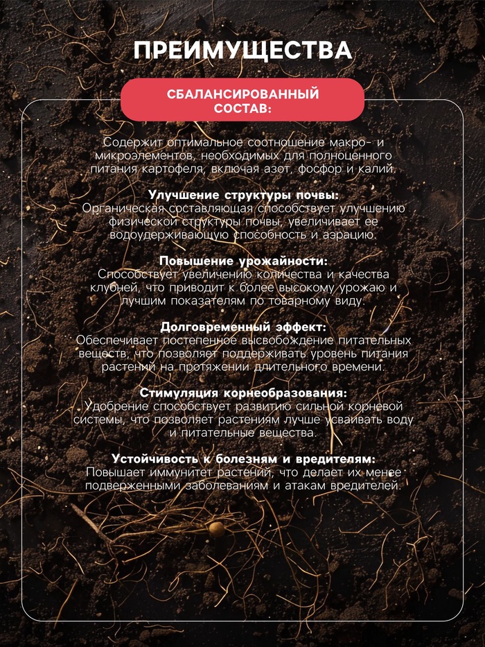 Данное удобрение содержит комплекс макро- и микроэлементов, таких как азот, фосфор, калий, магний, железо, марганец, цинк и другие. Они необходимы для роста и развития картофеля, а также для повышения урожайности и качества продукции.