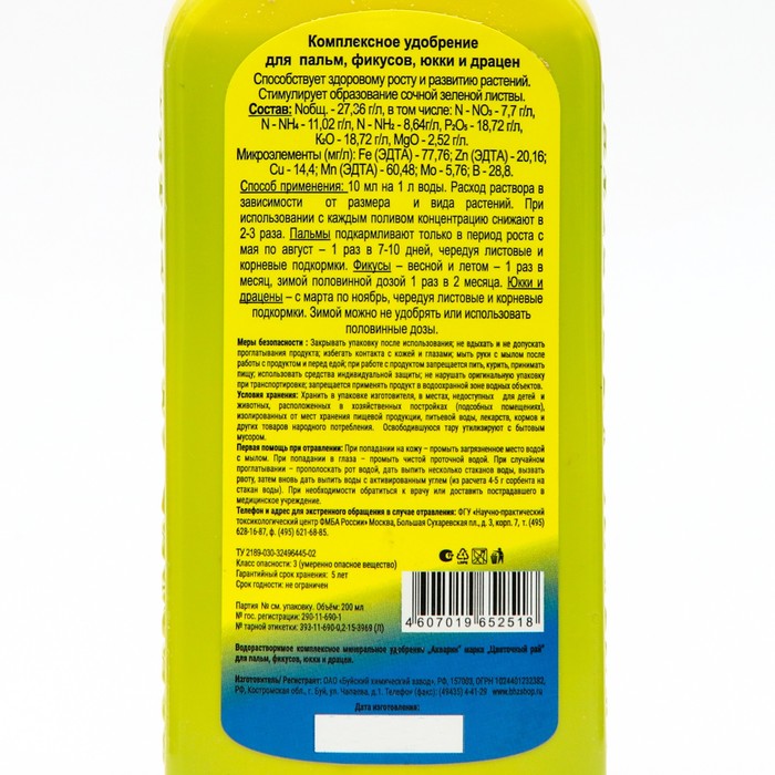 Жидкое комплексное удобрение «Цветочный рай» для пальм, фикусов, юкки и драцен, 200 мл