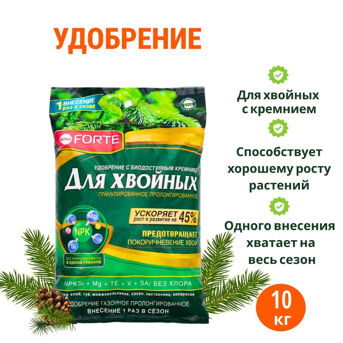 Удобрение Bona Forte хвойное (весна) с биодоступным кремнием, гранулы, пакет, 10 кг