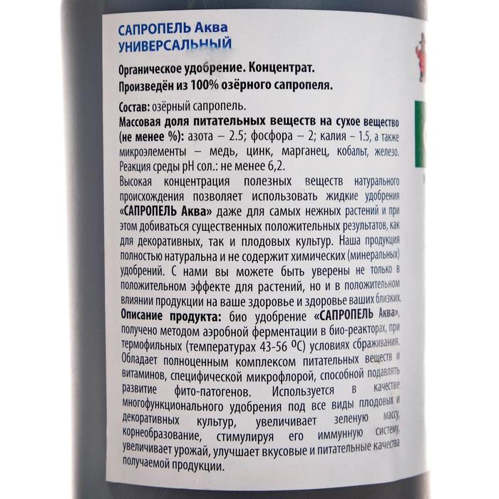 Био удобрение, получено методом аэробной ферментации озерного сапропеля концентрированного в био-реакторах, при термофильных (температурах 43-56 град. С) условиях сбраживания органического субстрата. Обладает полноценным комплексом питательных веществ и витаминов, специфической микрофлорой, способной подавлять развитие фито-патогенов. Используется в качестве многофункционального удобрения под все виды комнатных растений и цветов, увеличивает зеленую массу, корнеобразование, яркость цветения, стимулируя его иммунную систему. Био удобрение перед применением требует активного взбалтывания, разбавления водой в соотношении 1 к 20. Полученный рабочий раствор используют распылением или полива из расчёта 300 мл/растение для подкормки растений 1 раз в 10-15 дней. В зимний период частота подкормки сокращается до 20 дней. Удобрять можно в течение всего жизненного периода растений.Разбавить водой в соотношении 1 к 20. Полученный рабочий раствор используют распылением или полива из расчёта 300 мл/растение для подкормки растений 1 раз в 10-15 дней.Обладает полноценным комплексом питательных веществ и витаминов, специфической микрофлорой, способной подавлять развитие фито-патогенов.
