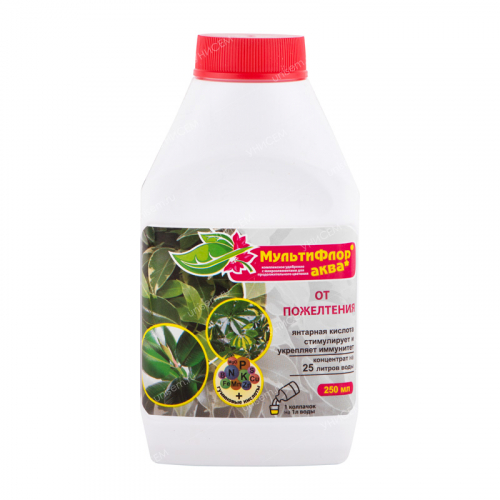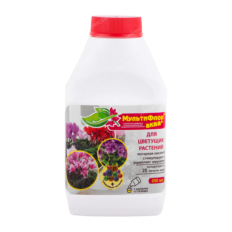 МультиФлор Аква для цветущих– жидкое комплексное хелатное минеральное удобрение с микроэлементами и гуминовыми кислотами. Применяется для корневой подкормки всех видов цветущих растений (гардения, бальзамин, фиалка, герань, цикламен, бегония, хризантема, гербера, пеларгония и др.). Препарат повышает декоративность растений, стимулирует бутонообразование, удлиняет период цветения.Массовая доля питательных веществ:N – 4 %, Р – 3 %, К – 5 %, микроэлементы (кобальт, бор, медь, марганец, молибден, цинк), гуминовые кислоты – 6 %, янтарная кислота.• Удобрение содержит полный комплекс веществ, необходимых для полноценного и сбалансированного питания растений.