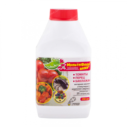 МультиФлор Аква для томатов, перцев, баклажан– жидкое комплексное хелатное минеральное удобрение с микроэлементами и гуминовыми кислотами. Применяется для корневой и внекорневой подкормки овощных культур. Препарат стимулирует рост растений, укрепляет корневую систему, способствует повышению урожая и улучшению вкусовых качеств плодов.Массовая доля питательных веществ:N – 4 %, Р – 4 %, К – 6 %, микроэлементы (кобальт, бор, медь, марганец, молибден, цинк), гуминовые кислоты – 0,5 %, янтарная кислота.• Удобрение содержит полный комплекс веществ, необходимых для полноценного и сбалансированного питания растений.