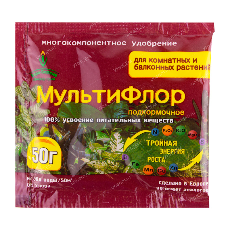 МультиФлор подкормочное для комнатных растений– кристаллическое, многокомпонентное удобрение с NPK и хелатизированными микроэлементами. Применяется для корневой и внекорневой подкормки комнатных и балконных растений. Препарат характеризуются пониженной нормой расхода и практически 100 % усвоением питательных веществ растениями.Массовая доля питательных веществ, %:N – 10; P2O5 – 40; K2O – 8; MgO – 3,0; S – 6,3; B -0,02; Cu – 0,01; Fe – 0,05; Mn – 0,05; Mo – 0,005; Zn – 0,01.• Удобрение содержит полный комплекс веществ, необходимых для полноценного и сбалансированного питания растений.