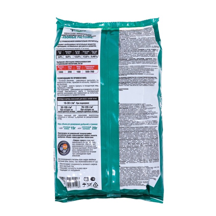 Оптимальные пропорции питательных элементов способствуют укреплению иммунитета и повышению зимостойкости растений. Наличие в составе магния и кальция обеспечивает сохранность зеленого окраса хвои круглый год.