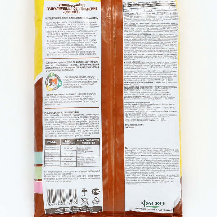 Удобрение сухое минеральное "Осень" Фаско 5М, гранулированное, 1 кг