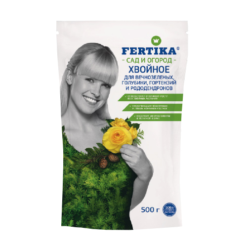 FERTIKA Хвойное для вечнозелёных (лето)– Комплексное водорастворимое удобрение содержащее микроэлементы. Рекомендуется для всех видов хвойных растений, рододендронов, азалий, гортензий, альпийской розы, садовой черники. Специально разработан для растений, которые предпочитают кислую почву, понижает кислотность почвы до уровня, приемлемого для таких растений.Преимущества:• не содержит хлор;• безопасность применения;• подкармливают в течение летнего сезона;• удобная форма применения – водорастворимая.