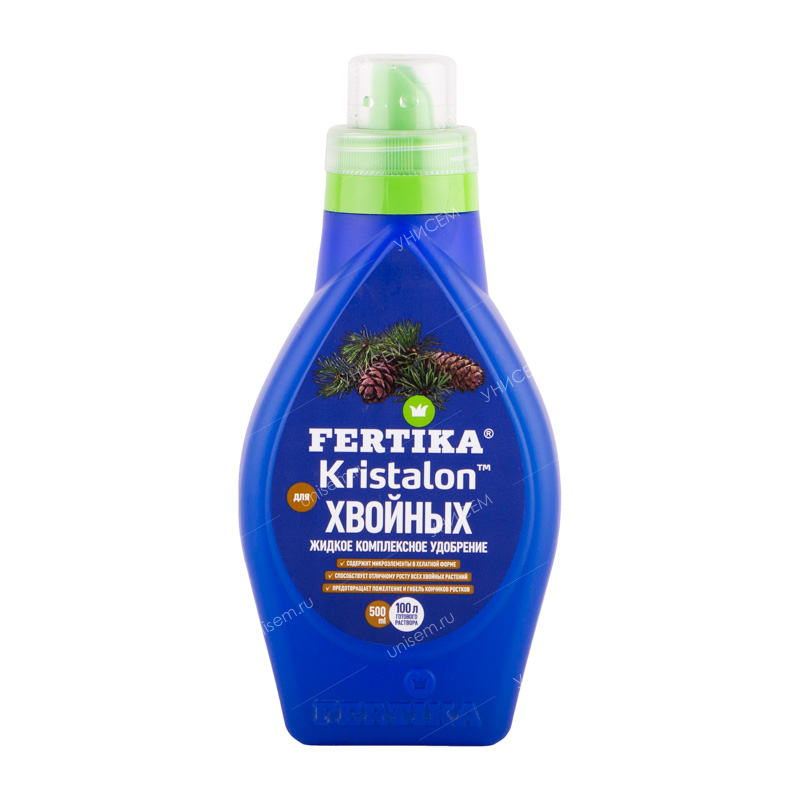 FERTIKAKristalon для хвойных культур– жидкое комплексное минеральное удобрение с микроэлементами в хелатной форме. Применяется в качестве корневой подкормки для комнатных (кипарисовиков, криптомерии, араукарии), и садовых хвойных растений. Препарат способствует активному росту и развитию, улучшает декоративные качества хвои, продлевает срок службы грунта горшечных культур, формирует устойчивость растений к неблагоприятным условиям среды.• Удобрение содержит полный комплекс веществ, необходимых для полноценного и сбалансированного питания растений.