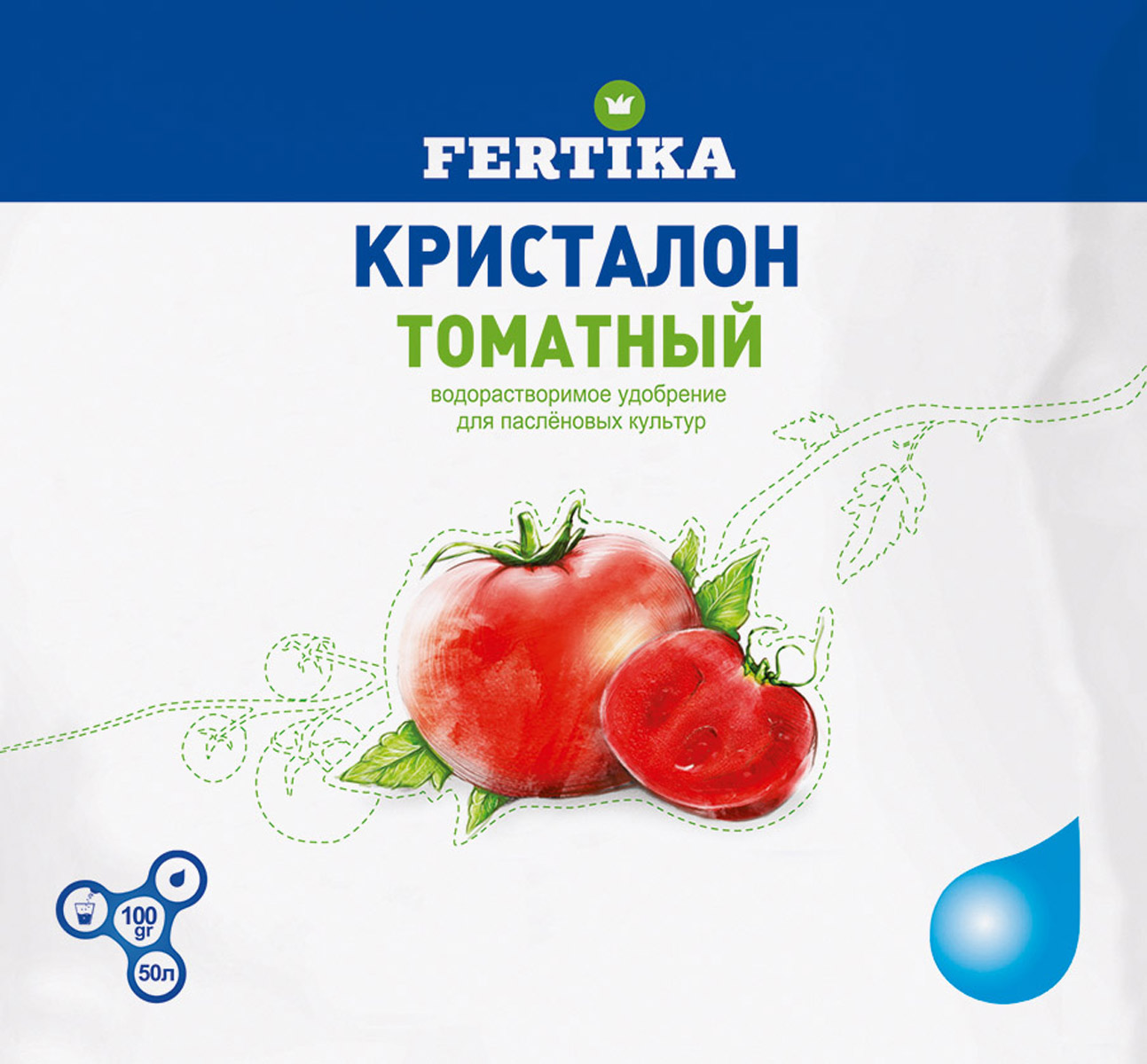FERTIKAKristalon Томатный– комплексное водорастворимое минеральное удобрение с микроэлементами в хелатной форме. Применяется в качестве корневой и внекорневой подкормки при выращивании всех культур семейства пасленовых, в том числе томатов, перца и баклажанов, в открытом грунте и теплицах. Препарат способствует активному росту и развитию, стимулирует образование плодов, улучшает урожайность и качество получаемой продукции, повышает содержание сахара и витаминов в плодах, формирует устойчивость к неблагоприятным факторам окружающей среды.• Удобрение содержит полный комплекс веществ, необходимых для полноценного и сбалансированного питания растений.