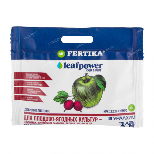 Fertika Leaf Power для рассады– комплексное водорастворимое минеральное удобрение с микроэлементами. Применяется в качестве корневой и внекорневой подкормки при выращивании рассады овощных и цветочно-декоративных культур. Препарат повышает урожайность, улучшает качество плодов и овощей, декоративных культур, содержит микроэлементы в хелатной форме, формирует устойчивость растений к засухе и низким температурам.• Удобрение содержит полный комплекс веществ, необходимых для полноценного и сбалансированного питания растений.