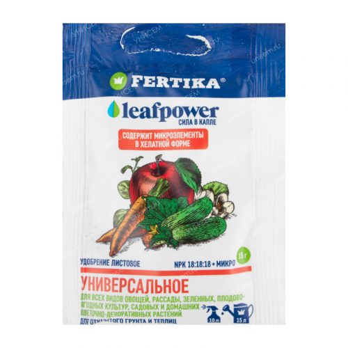 Fertika Leaf Power Универсальное– комплексное водорастворимое минеральное удобрение с микроэлементами. Применяется в качестве корневой и внекорневой подкормки при выращивании всех овощных, цветочно-декоративных, плодово-ягодных культур в открытом грунте и в теплицах. Препарат обеспечивает дополнительным питанием в разные фазы развития культур, повышает энергию и силу роста, устойчивость растений к засухе и низким температурам, компенсирует недостаток питательных элементов в течение неблагоприятных условий роста, когда потребности растений превышают поглощающую способность корневой системы.• Удобрение содержит полный комплекс веществ, необходимых для полноценного и сбалансированного питания растений.