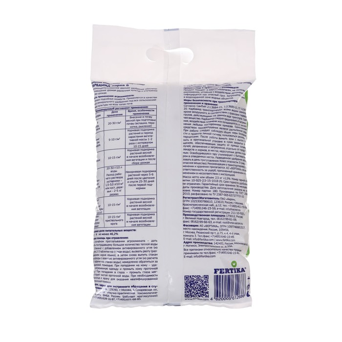 FERTIKA Карбамид - концентрированное азотное удобрение для повышения урожайности различных сельскохозяйственных культур.ПреимуществаУниверсальный состав подходит для всех растений: овощей, ягод, плодовых деревьев.Средство быстро растворяется в воде и всасывается корнями.Удобрение безопасно, не содержит хлора.Область примененияУдобрение FERTIKA карбамид (мочевина) растворяют в воде и используют для подкормки плодовых деревьев, ягодных кустарников, овощных культур, земляники. Рекомендуется вносить удобрение весной при перекопке почвы и летом в начале вегетационного периода.