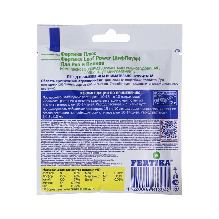 Удобрение минеральное «Фертика» «Leaf Power» для роз и пионов, 50 г