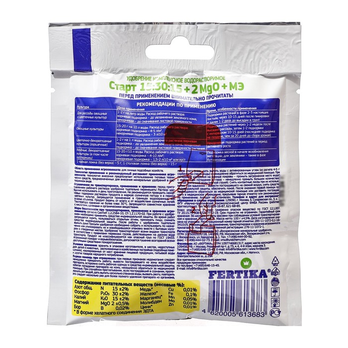 Удобрение минеральное Фертика Старт NPK 15:30:15 + МИКРО, 100 г