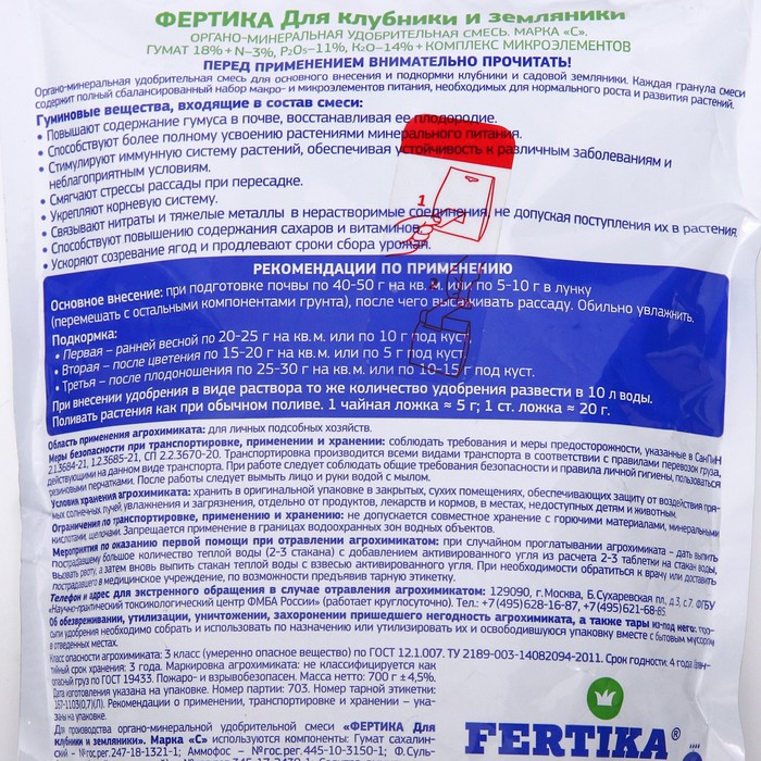 ПЕРЕД ПРИМЕНЕНИЕМ ВНИМАТЕЛЬНО ПРОЧИТАТЬ! Органо-минеральная удобрительная смесь для основного внесения и подкормки клубники и садовой земляники. Каждая гранула смеси содержит полный сбалансированный набор макро- и микроэлементов питания, необходимых для нормального роста и развития растений. Гуминовые вещества, входящие в состав смеси: