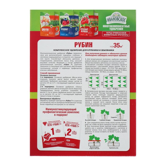 Комплекс добавок «Рубин» укрепляет иммунитет и стимулирует рост кустов. Полноценное питание спасает клубнику и землянику от распространённых болезней: мучнистой росы, фузариозного увядания, ризоктониоза. Средство оздоровляет почву, улучшая её физические, химические, биологические и протекторные свойства.
