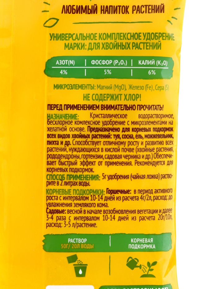Стимулирует рост и развитие саженцев, предотвращает пожелтение хвои, дает быстрый результат. Эффективно для всех хвойных, садовой черники, рододендронов, гортензий и др.