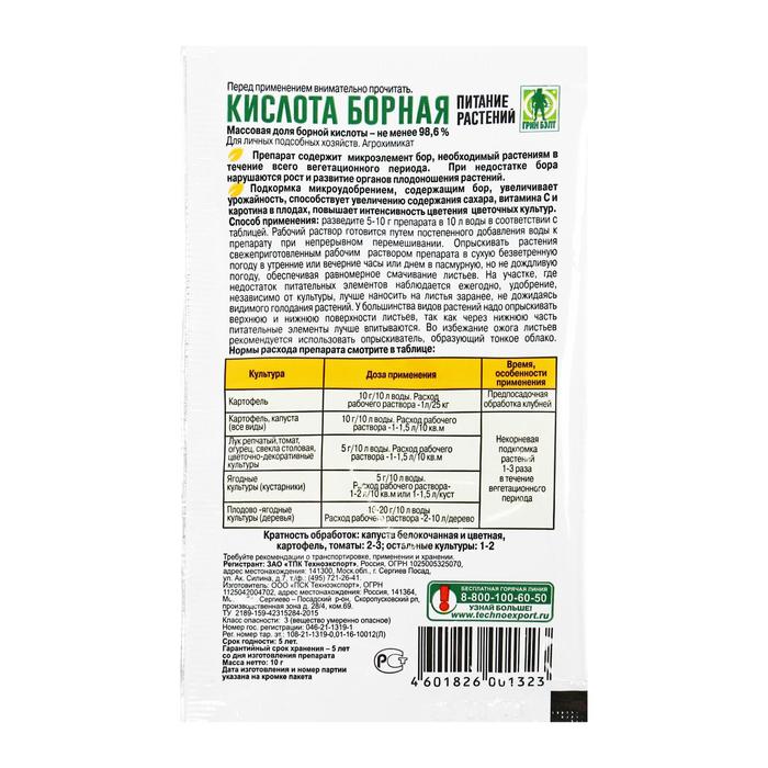 Удобрение Борная кислота «Грин Бэлт» микроудобрение, 10 г