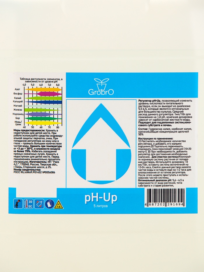 GroBro PH UP — это простое и надежное решение для всех, кто стремится к высокой урожайности и здоровью своих растений. С этим удобрением вы всегда будете уверены в результате. Регулируйте pH легко и экономно, доверяя проверенному качеству. Выбирайте GroBro PH UP — ваш партнер в гидропонике, где каждый литр работает на ваш успех!