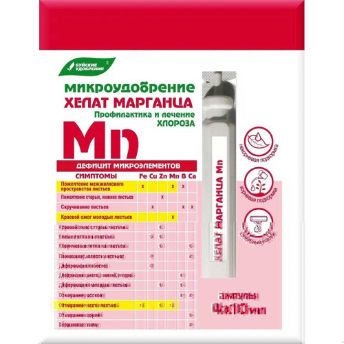 Буйские удобрения Хелат марганца – комплексное органическое соединение, которое активирует действие различных ферментов, входит в их состав, обеспечивает окислительно-восстановительные процессы, фотосинтез, дыхание растений, снижает транспирацию, повышает способность растительных тканей удерживать воду, ускоряет общее развитие растений, положительно влияет на их плодоношение. Подкормки хелатом марганца помогают предотвратить или устранить хлороз для всех видов растений. Симптомы применения: пожелтение молодых листьев, пожелтение между жилками, омертвление тканей растения.