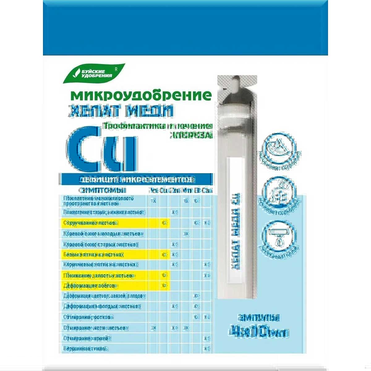 Хелат Меди 4х10мл СоставМикроэлементы: Cu - 30 мг/лpH (1% p-pa): 6.5Внешний вид: Жидкость голубого цветаДоп.информация: Не оставлять ампулы с раствором на солнечном свету. Химическое соединение фотолабильно, т.е. со временем распадается от солнечноного света. Хранить в тёмном, прохладном помещении.Доза применения препаратаНекорневая подкормка (до смачивания поверхности листьев): 10 мл / 5 л воды.Корневая подкормка (обычная поливочная норма 1 раз в 14-21 день): 10 мл / 20 л воды.Капельный полив (внесение с каждым поливом): 10 мл / 300 л воды.комплексное органическое соединение, которое улучшает интенсивность фотосинтеза, способствуют образованию хлорофилла, положительно влияет на углеводный и азотный обмены, повышает устойчивость растений против грибных и бактериальных заболеваний.
