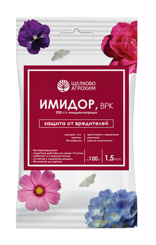 Средство «Имидор, ВРК» предназначено для борьбы с вредителями на цветочно-декоративных растениях. Препарат имеет ярко выраженное контактно-кишечное действие – молниеносно уничтожает тлю, цикадки, белокрылку и других вредных насекомых. Эффект виден уже через несколько часов. «Имидор, ВРК» активен в жаркую погоду и устойчив к смыванию дождем.