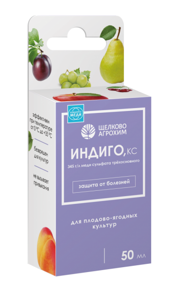 «Индиго, КС» – медьсодержащий препарат нового поколения, предназначенный для борьбы с комплексом болезней на плодово-ягодных культурах. Ионы меди попадают в клетки фитопатогенных спор и начинают взаимодействовать с ферментами. Как результат, споры прекращают расти и не могут нанести вред растению. «Индиго,КС» – концентрированный препарат в жидкой форме, который не выпадает в осадок. Он безопасен для культур, совместим с другими препаратами. Действие «Индиго, КС» начинается сразу после обработки и продолжается в течение 14 дней в зависимости от погодных условий и инфекционной нагрузки. Максимальный фунгицидный эффект проявляется при профилактическом применении до появления симптомов болезни. Активен при температуре от 0 °C до +35 °C, не смывается дождём.