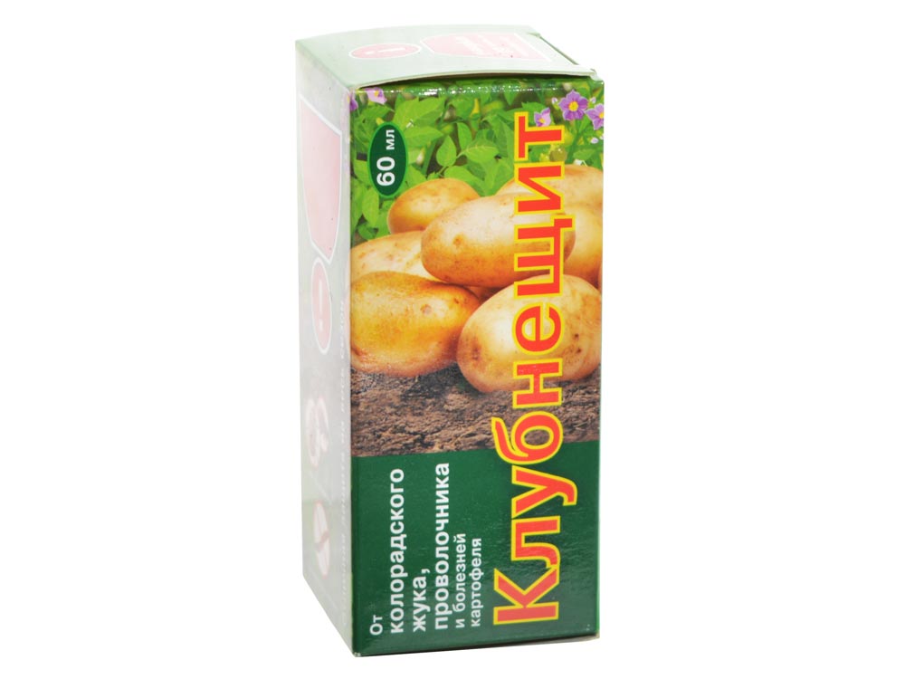 Клубнещит 60мл (для защиты растений от вредителей) применяется для защиты клубней перед посадкой от колорадского жука, проволочника и болезней картофеля.