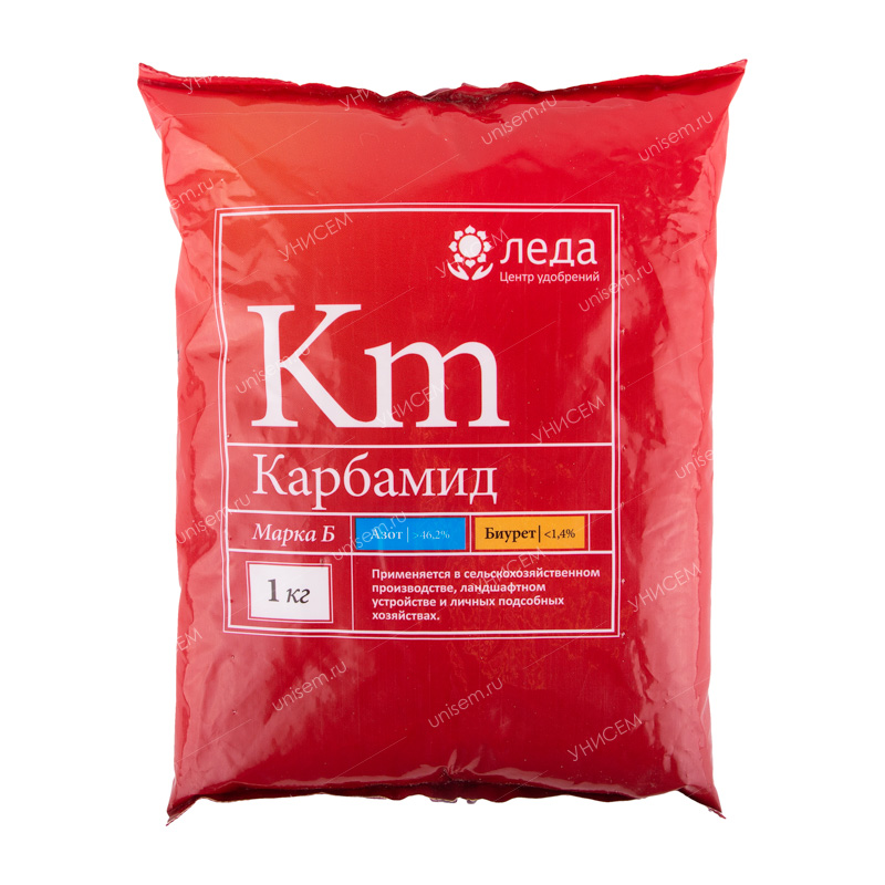 Леда Карбамид– высокоэффективное водорастворимое минеральное удобрение, содержащее максимальное количество азота (46,3%). Применяется для основного внесения и корневой подкормки под все сельскохозяйственные культуры. При выращивании овощных, бахчевых культур и риса он незаменим. Препарат подкисляет почву и особенно эффективен при орошении и при промывном водном режиме почв, так как может поглощаться почвой в виде целой молекулы и удерживаться сильнее, чем иные виды удобрений.• Удобрение содержит полный комплекс веществ, необходимых для полноценного и сбалансированного питания растений.
