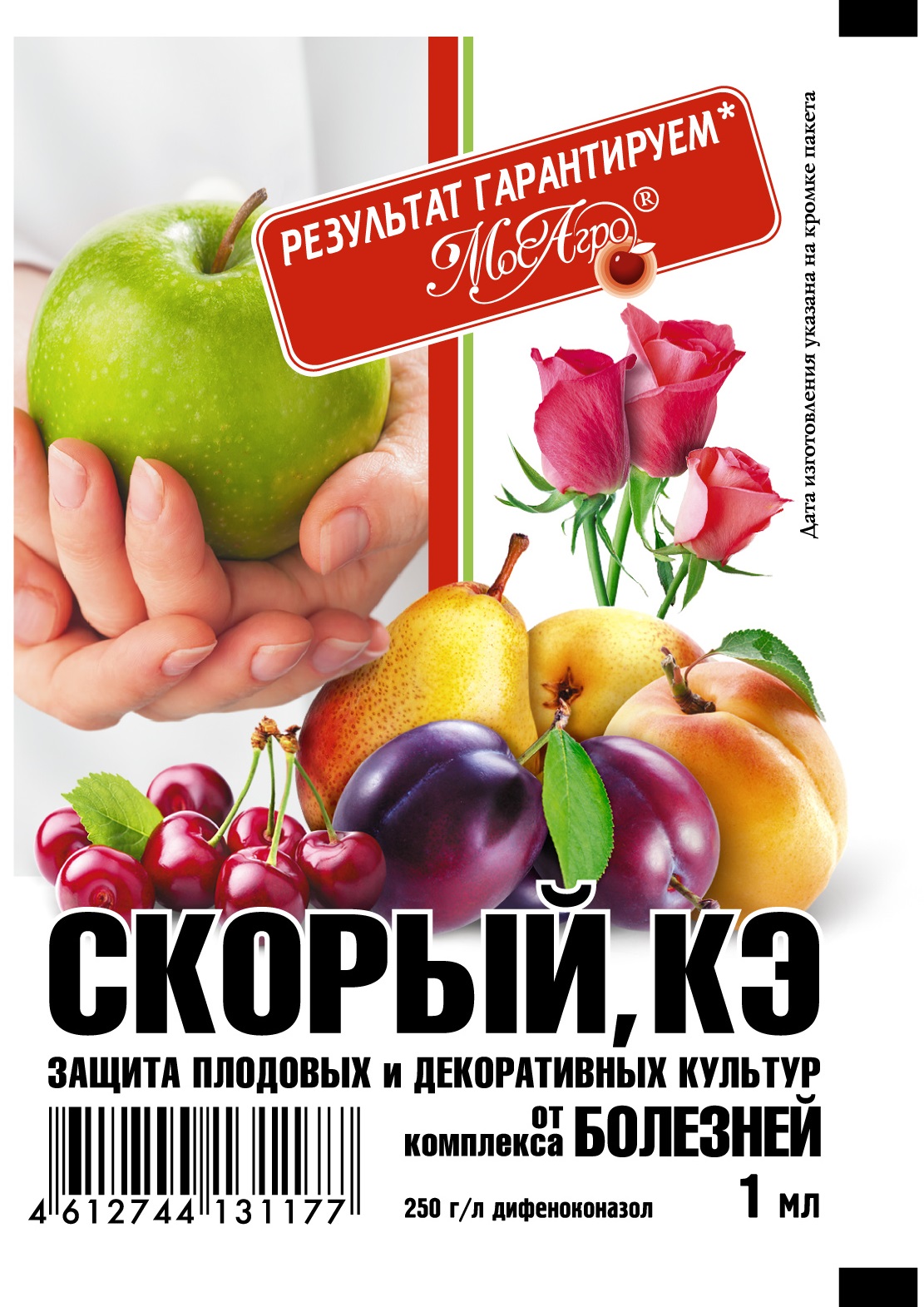 МосАгро Скорый– фунгицид на основе действующего вещества дифеноконазола для защиты плодовых и декоративных культур от комплекса болезней. Защитный эффект сохраняется в течение 2-3 недель. Скорость воздействия – в течение 2-4 часов. Не фитотоксичен в рекомендуемых нормах.Преимущества:• обладает стимулирующей активностью;• защищает культуры от комплекса болезней;• способствует закладке урожая на следующий год.