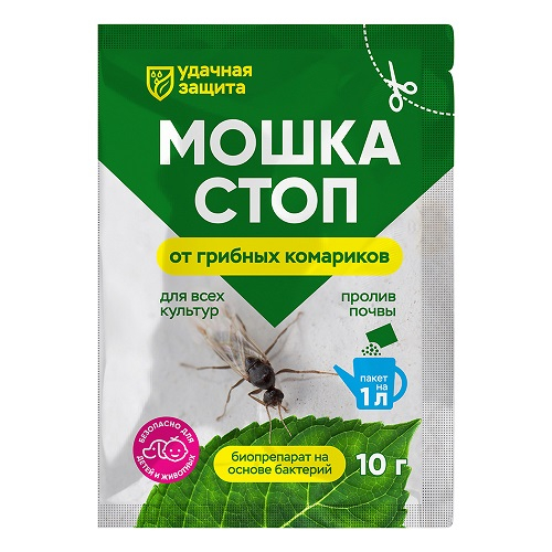 «Мошка стоп - Удачная защита» – это инновационный бактериальный инсектицид, специально разработанный для борьбы с личинками: грибных комариков (сциарид) и почвенных мушек.