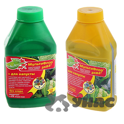 «Мультифлор Аква» — комплексное минеральное удобрение с микроэлементами и гуминовыми кислотами для подкормки всех сортов капусты. Это универсальное средство применяется на протяжении всего вегетационного периода растений для корневой или листовой подкормки. В ранние фазы развития плода нужно поливать и опрыскивать его подкормочным раствором. Применение удобрения стимулирует рост и завязывание кочанов, укрепляет корневую систему, повышает плотность и размер кочанов. Способствует повышению урожая и улучшению вкусовых качеств.