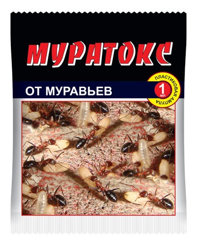 МУРАТОКС» — инсектицид широкого спектра действия, для борьбы с муравьями, блохами, личинками подвальных комаров (концентрат эмульсии, 600 г/л диазинона). Эффективно уничтожает муравьев в местах их скопления и на пути передвижения, в том числе в отмостках домов и на тротуарах.
